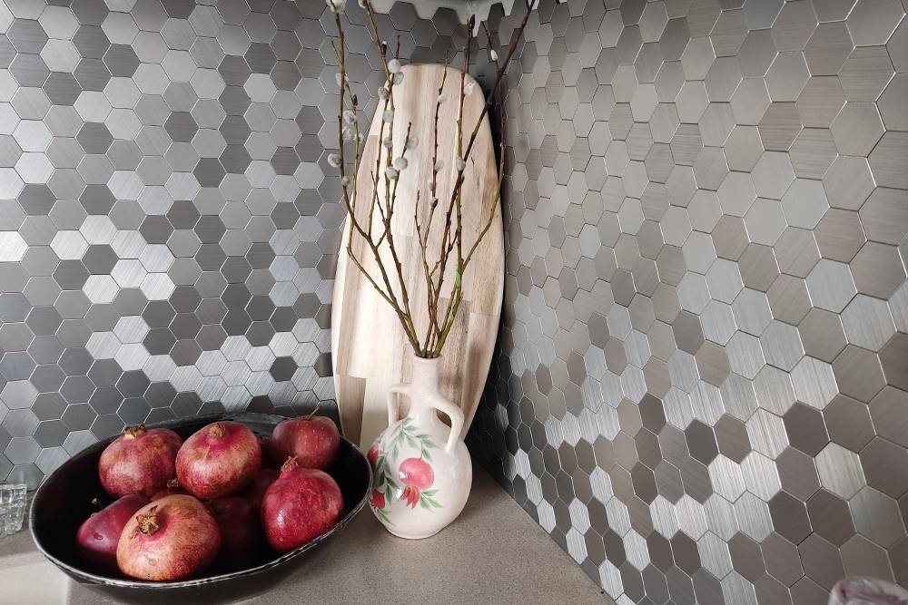 Пока изготавливали кухню, мы смотрели в магазинах разные мозаики. В итоге нашли в «Леруа Мерлене» плитку «металлические соты» на клеевой основе. Цена уже тогда была кусачая — 431 Р за штуку. Нам потребовалось 33 штуки, и мы потратили 14 223 Р.
