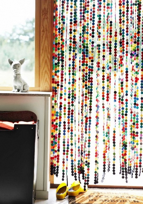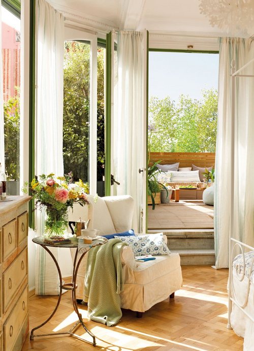 К примеру, в темной комнате нужно обязательно убрать тяжелые портьеры и заменить их легкими шторами из летящих тканей. Причем, цветовую гамму желательно выбирать яркую, жизнерадостную, похожую на солнышко, которого так не хватает в этой комнате – желтый, оранжевый, красный цвета как раз для этих целей подходят превосходно. Оригинальные летние шторы можно сделать из собранных в пучок отрезов шифона нескольких цветов, пусть пучок красной ткани плавно перетекает в желтый, тот в свою очередь в лаймовый и т.д. Получается очень свежо! Подойдут для этой цели и белые летящие занавески.