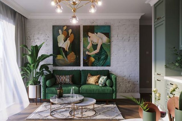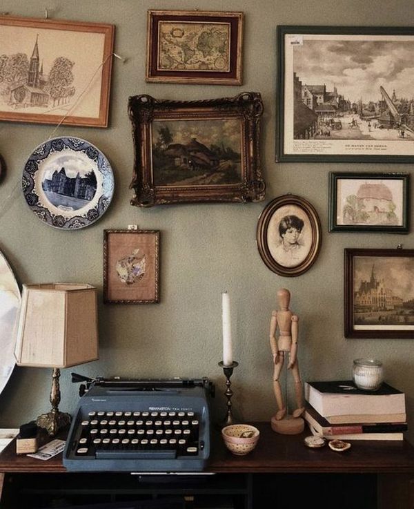 В стилях типа арт-деко, эклектика, кантри, шебби-шик, бохо, ретро как раз-таки будут уместны красивые рамы, но обратите внимание: картины маленькие и расположены рядом друг с другом в хаотичном порядке. Это очень трендовый прием, с помощью которого мы расставляем правильные дизайнерские акценты