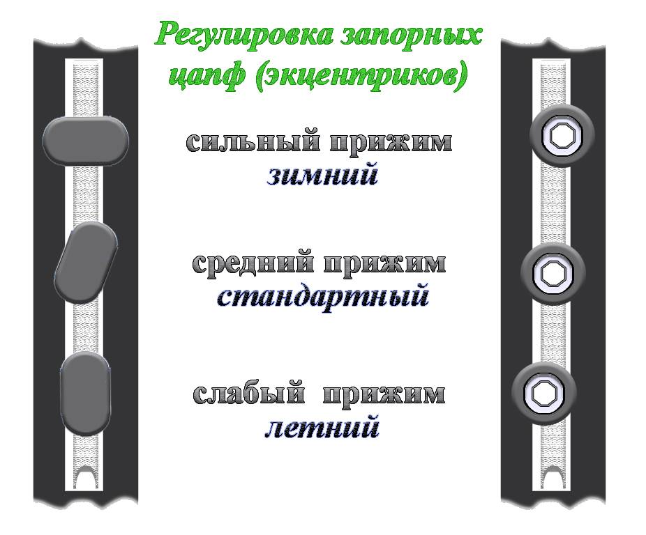 Прижим створки к рамам осуществляется цапфами (подвижными выступами из металла, расположенными на боковой части створки). Когда ручка окна поворачивается, цапфы выходят за пластины, расположенные на раме. Чтобы наладить прижим, используют эксцентрики. Металлические цапфы могут иметь различные формы, поэтому для их настройки могут понадобиться разные инструменты
