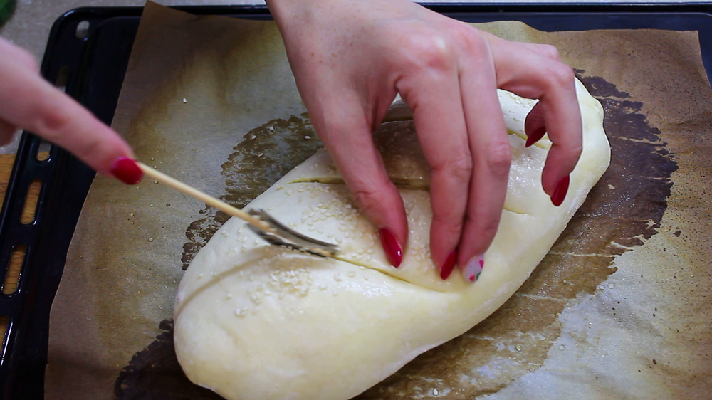 - Смазать верх подсолнечным маслом и присыпать кунжутом