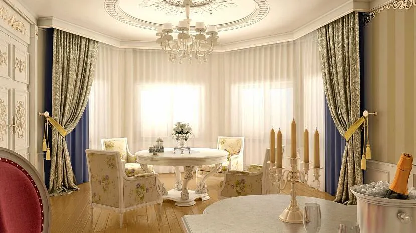 Не только цветовое решение имеет значение. Чтобы хорошо вписаться в классический интерьер, штора должна быть массивной, прямоугольной, возможно, дополненной ламбрекенами. Барокко, рококо, ампир и прочие «богатые» стили подразумевают использование портьер с фигурными краями и большим количеством украшений.