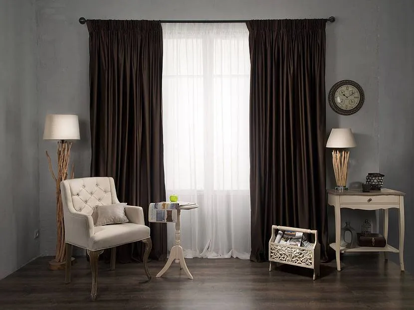 Коричневый цвет стен делает комнату темной, поэтому, чтобы не усугублять ситуацию, стоит выбирать светлые оттенки штор. Классический вариант — бежево-коричневая цветовая гамма. Из других оттенков с коричневым хорошо сочетаются голубой, бирюзовый, розовый, темно-синий, оранжевый и бордовый.