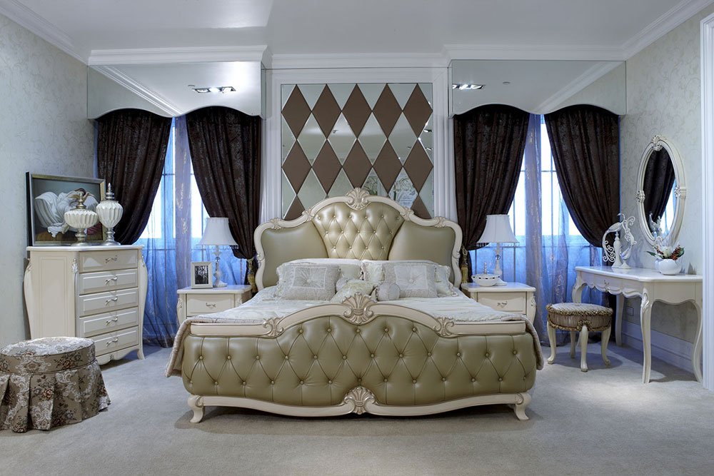 Если золото используется лишь на одной стене, то можно подобрать такие же шторы. Немного упростить интерьер помогут белый и бежевый. Кроме того, необычные сочетания получаются с голубыми оттенками.