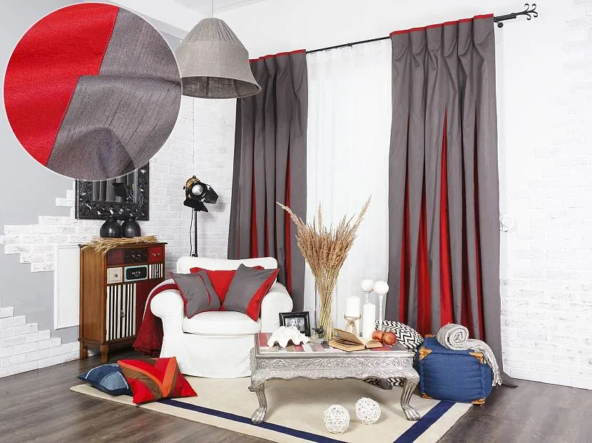 Портьеры под обои серого тона могут быть красными. Для стен с отделкой прохладных тонов подойдут вишневые или малиновые завесы. Ярко-красная ткань будет выигрышно выглядеть в комплексе с теплой палитрой.