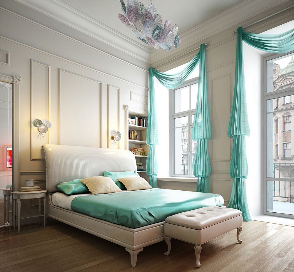 Этот спокойный цвет часто используется в спальне или гостиной. К нему подходят шторы сложных пастельных тонов. Это может быть кремовый, пудровый, бледно-розовый, персиковый, бирюзовый и фисташковый. Чем бледнее цвет, тем легче и просторнее будет выглядеть комната.