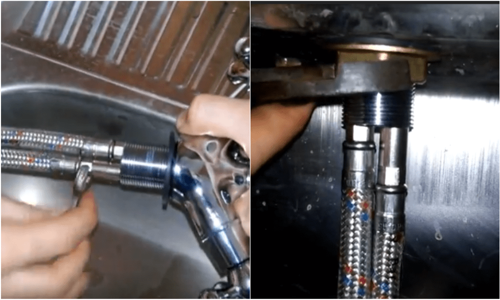 Каждый из шлангов (горячей и холодной воды) должен вкручиваться в своё отверстие и подсоединяться к нужной подводящей трубе. Далее подкладываем уплотнительное кольцо и продеваем шпильку с подводкой в отверстие раковины, вставляем металлическую накладку, затягиваем шпильку гайкой. На некоторых изделиях присутствует две шпильки, что позволяет более надёжно закрепить кран.