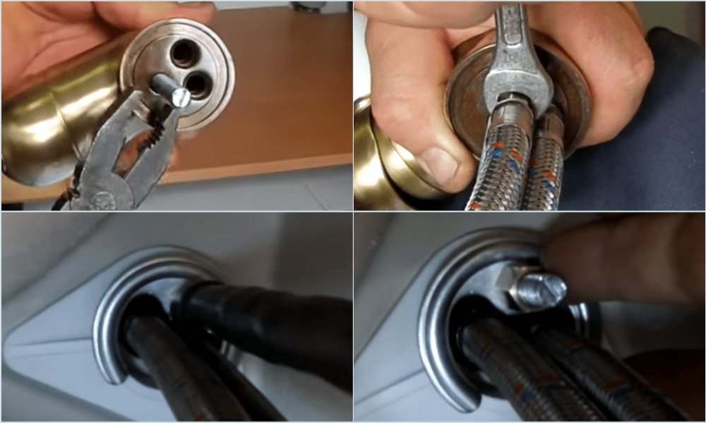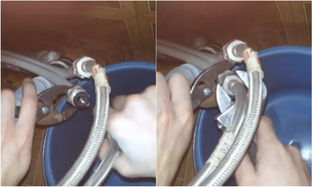 Демонтаж старого смесителя мойки с тумбы начинается с откручивания шлангов подводки с труб