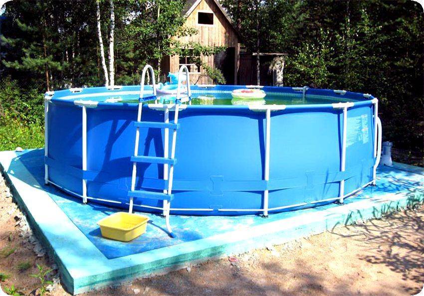 Размещается он с некоторым углублением в грунте или просто на поверхности. Участок под бассейн необходимо подготовить: убрать всю растительность, а дно неглубокого котлована разровнять и засыпать песком или гравием. В некоторых случаях заливается даже бетонная подушка.