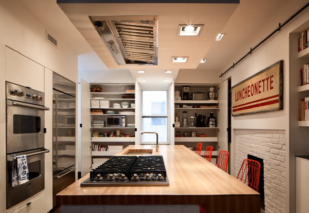 Сегодня популярностью пользуется открытое хранение. Стеллажи во всю высоту кухни и подвесные полки – самые распространенные и современные альтернативы кухонных гарнитуров. Минусом такого способа становится пыль. Большим плюсом является то, что вы тщательнее выбираете посуду. Открытое хранение способствует минимализму.