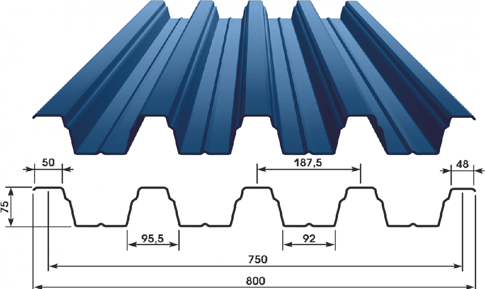 Рекомендован для использования на кровлях, несущих конструкциях и несъёмных опалубках. Заготовки имеют габаритную ширину 0,8 метра, полезную ширину — 75 сантиметров, высоту профиля — семь с половиной сантиметров, толщину стали — от 0,65 до одного миллиметра.