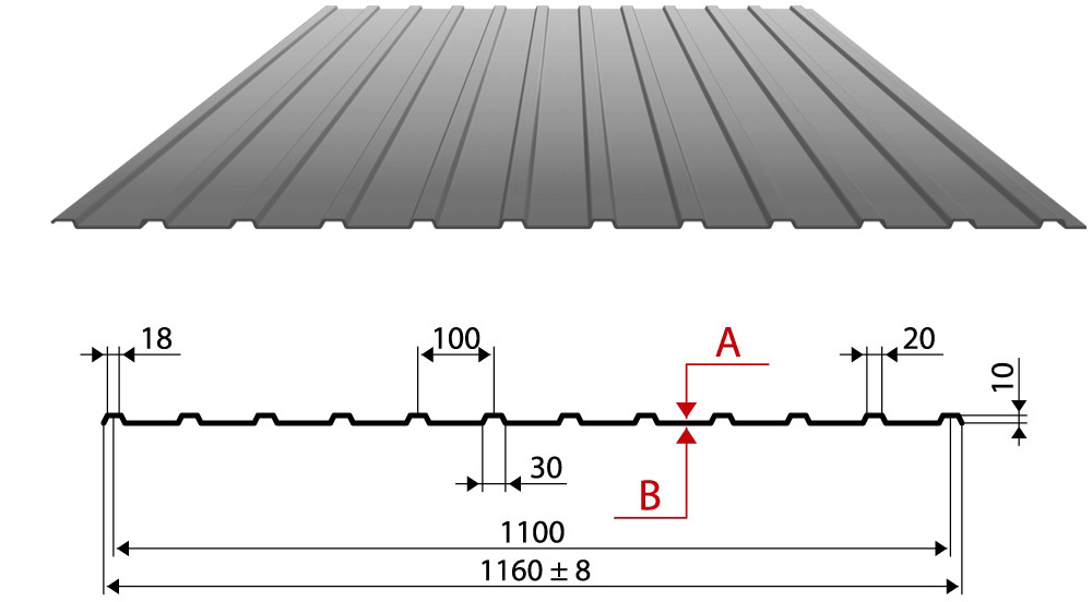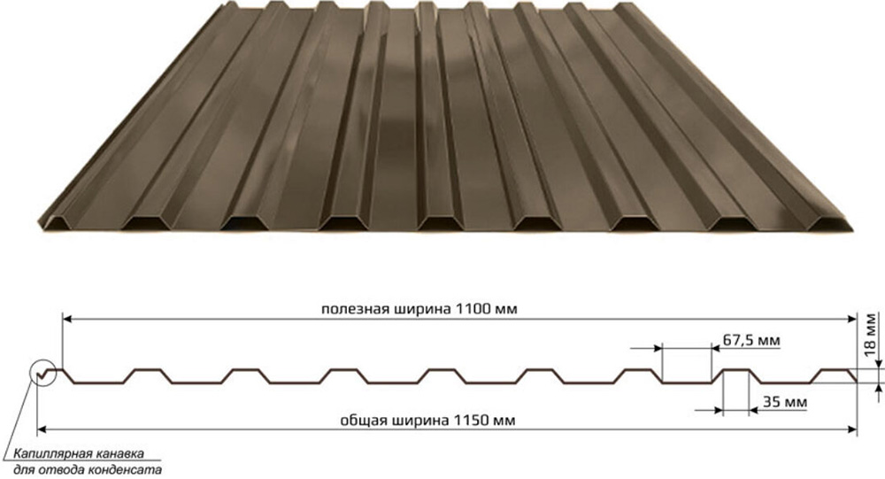 Используется для кровель, фасадов и заборных ограждений. Заготовки имеют габаритную ширину 1,15 метра, полезную ширину — 1,1 метра, высоту профиля — 1,8 миллиметра, толщину стали — от 0,4 до 0,8 миллиметров.