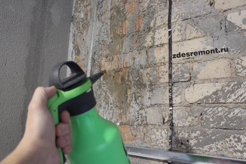 - после этого следует смочить стену водой, для чего можно использовать опрыскиватель или простой веник;