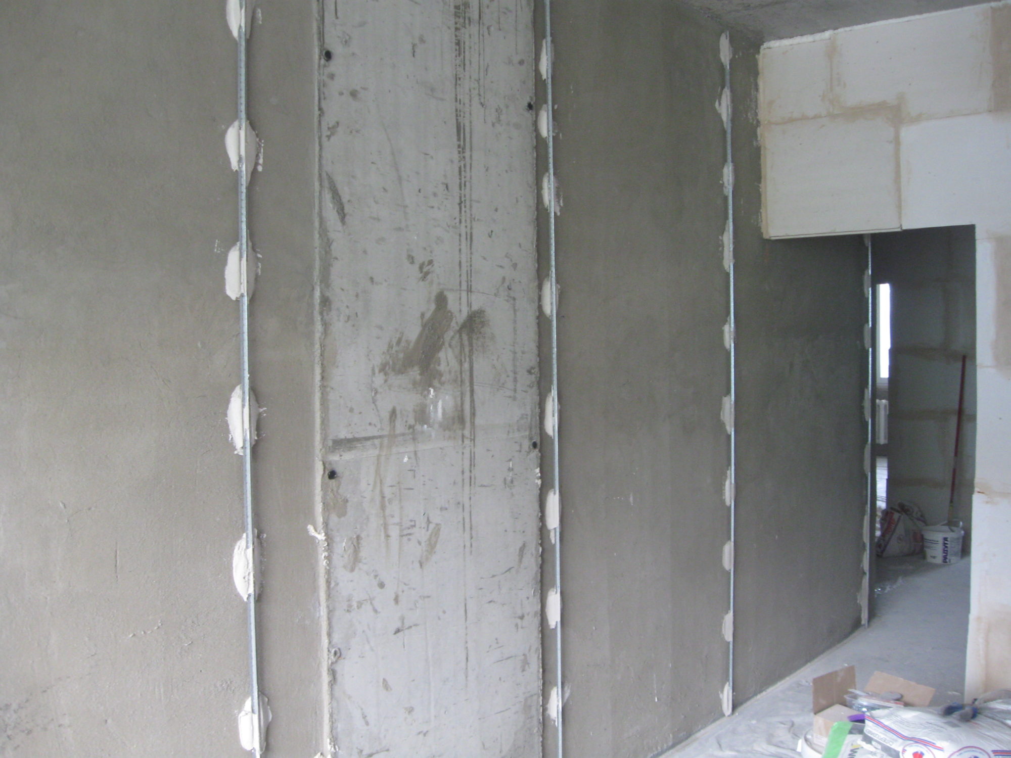 - Гладкие бетонные стены штукатурят смесью цемента, гипса и кварца.