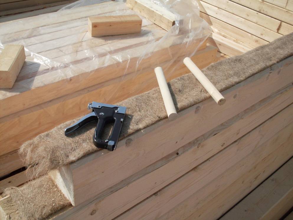 - Утеплитель укладывают посередине бревна или бруса, чтобы он лишь немного (4-5 см) выступал за его пределы. Дополнительно можно закрепить теплоизоляцию степлером.