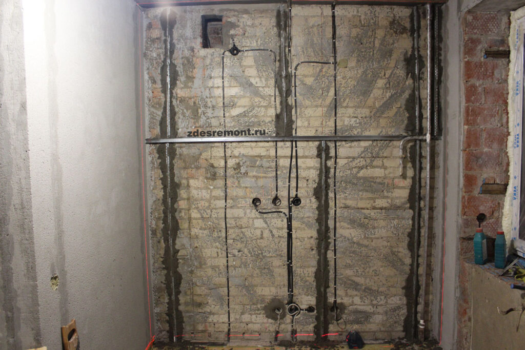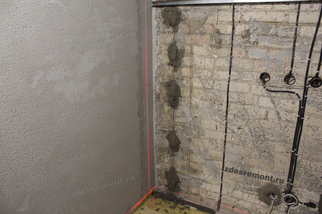 При любом способе монтажа важно установить точку отсчета – это будет самая выступающая часть стены. В этом месте слой штукатурки будет минимальными и все остальные точки стены надо подогнать под это положение