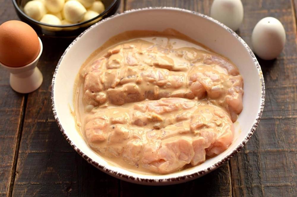 - Куриное филе обработать и опустить в маринад. Затянуть пленкой и оставить мариноваться на полчаса — час.