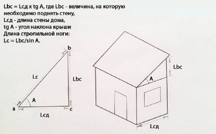 Lbc=Lсд x tgA, где Lbc – высота, на которую нужно поднять стену; Lсд – длина стены дома (без учета дополнительного подъема для ската); А – выбранный угол наклона кровли.
