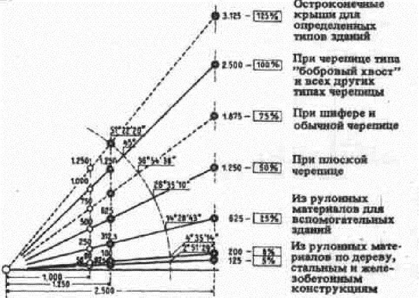 Рекомендованный уклон в градусах для разных типов кровельных материалов во избежание течей: