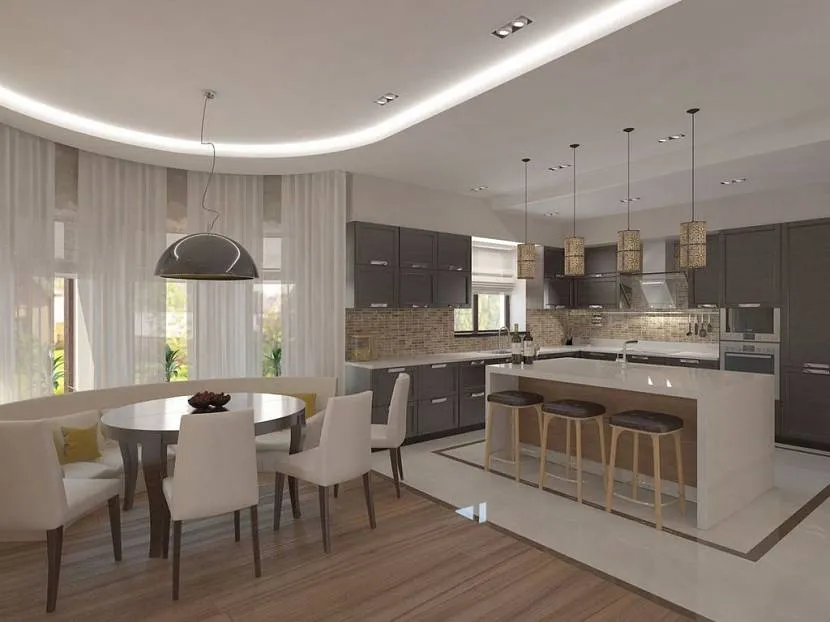Лестница может стать условным разграничителем пространства. Установка барной стойки ломаной геометрической линии или в виде овала отделит кухню от общего пространства.Фото проекты домов и коттеджей с интересным совмещением представлены в галерее.