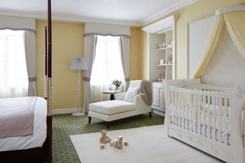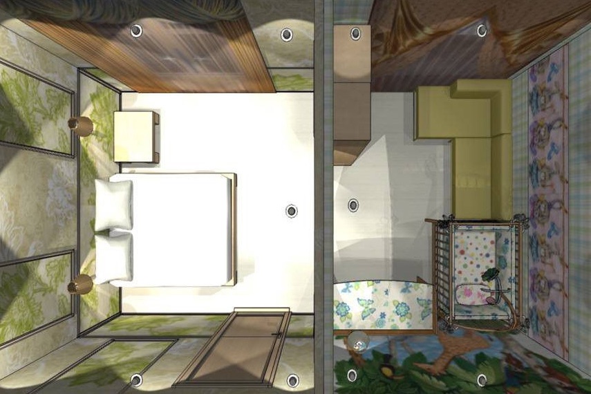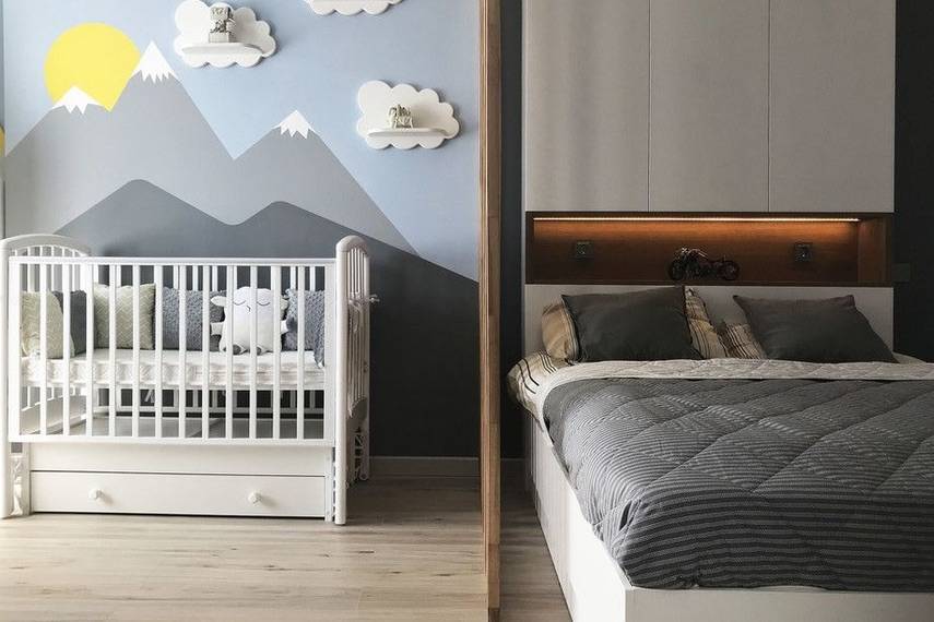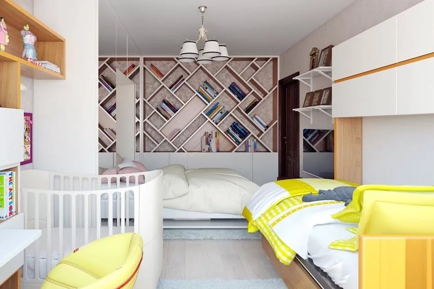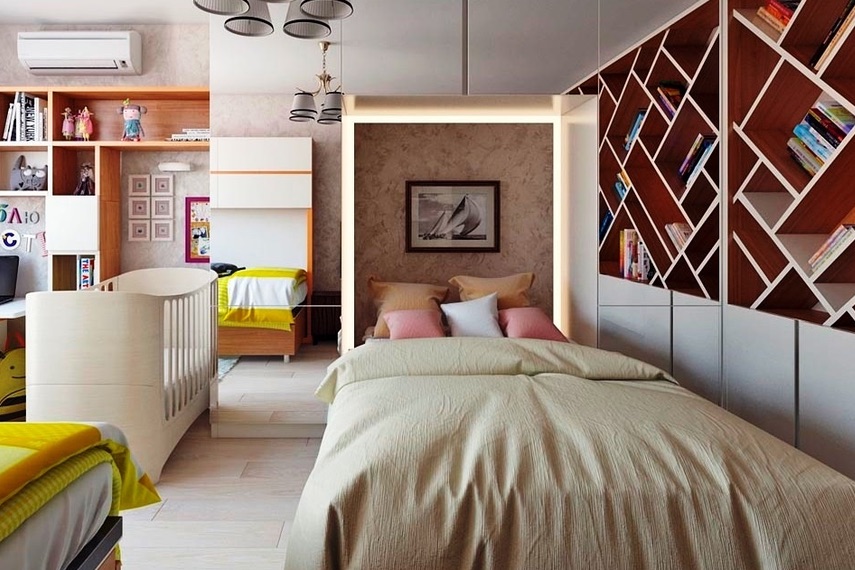 В случае проживания родителей совместно с ребенком, чтобы не превратить помещение в нагромождение мебели, дизайнеры рекомендуют разделить его на отдельные зоны. Здесь для разделения помещения возможно использовать перегородку или стеллаж. Более мягким вариантом будет ширма или штора, а также возможна установка подиума для родительской кровати. Детское место можно также обыграть подсветкой или обоями.