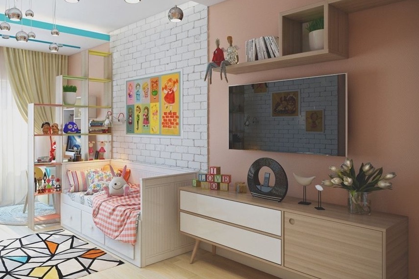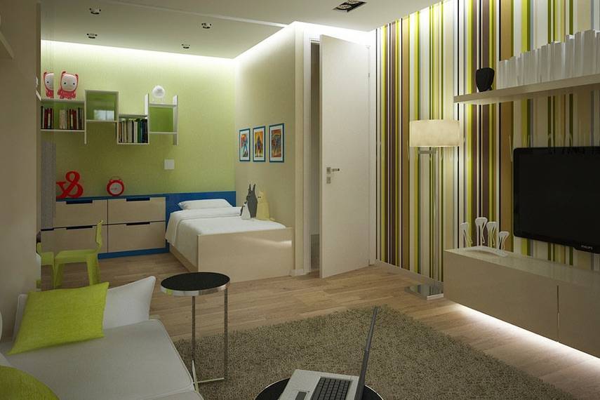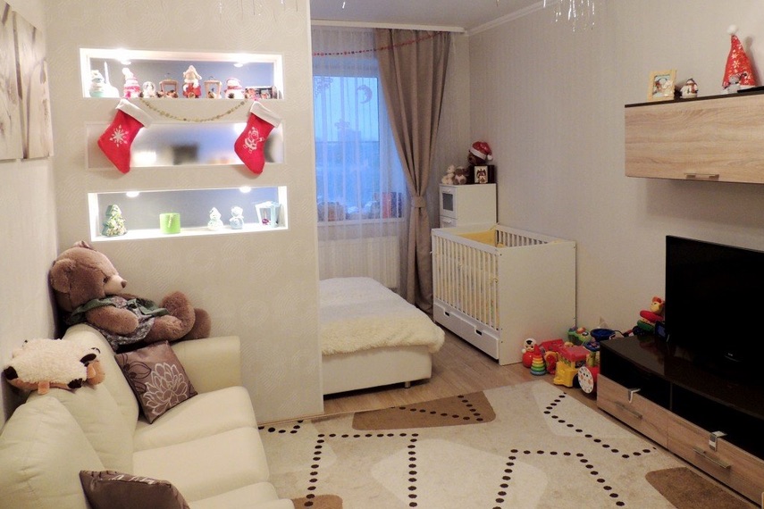 Гостиная, совмещенная с детской, не всегда достаточно освещена и часто захламлена лишней мебелью. Этих неудобств можно избежать. В комнатах с одним окном перегородка должна пропускать дневной свет в ту половину, которой окна не досталось. А мебель, без которой можно обойтись (пуфики, софа), следует убрать. Для маленькой гостиной будет достаточно дивана, стенки или стеллажа и столика. Телевизор лучше закрепить на кронштейн. В детской удобно использовать компактные наборы мебели, которые позволяют сэкономить место.