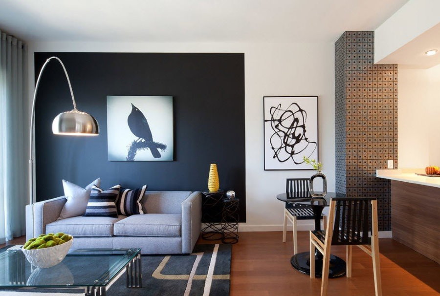 Визуально разделить помещение на две части помогает использование в отделке разных цветов. Главное, чтобы они были одинаковы по температуре и насыщенности. Обычно для гостиной выбирают яркие цвета, для спальни – более приглушённые, спокойные.