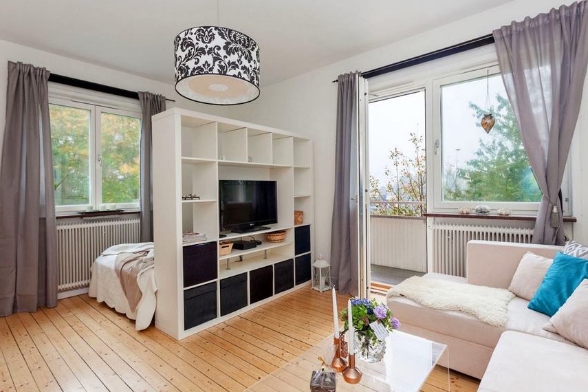 Разделение однокомнатной квартиры стеллажом на зоны