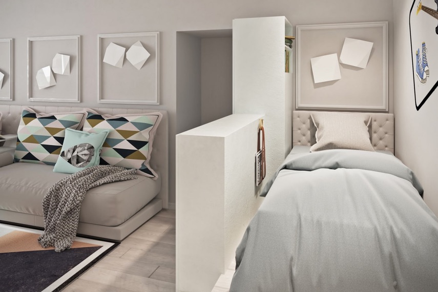 На помощь снова приходит диван-кровать, если член семьи в проходной комнате только ночует. Днем спальное место складывается и освобождает квадратные метры.