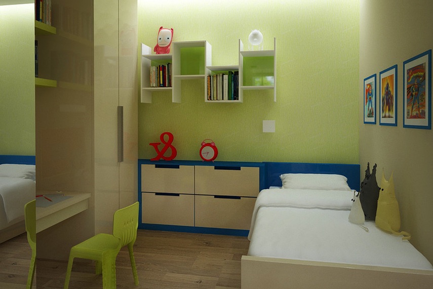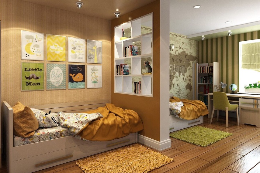 - Детская. Выделение разных функциональных зон применяется наиболее часто в детской спальне. Здесь как минимум разделяют спальное место, игровую площадку, а также место для учебы и творчества. Кроме того дополнительно можно организовать, например спортивный уголок. Также необходимость разделения детской спальни возникает, если в ней проживает 2 ребенка, тогда зонирование комнаты производится с учетом потребностей и интересов обоих.