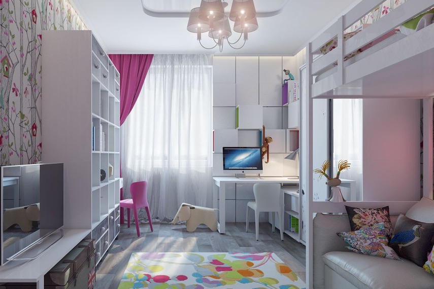 В детской комнате используются различные приемы зонирования, дополняя друг друга. Например, основное деление осуществляется при помощи раздвижной, складной и прочей многофункциональной мебели, при этом дополнительно используют выделение обоями различными по цвету либо фактуре, освещением и другими элементами декора. Здесь главную роль играют не визуальные характеристики, а функциональность и комфорт для ребенка. Такие дизайнерские приемы приучают детей с ранних лет к правильной организации быта и упорядоченности.