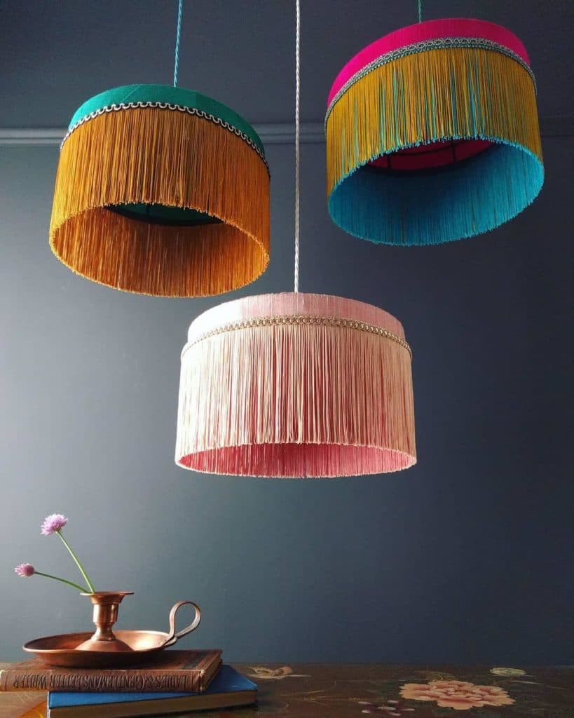 Красиво и необычно можно украсить не только настольную лампу, но и люстры. Старые плафоны можно заменить на разноцветные ткани с густой бахромой. Подобный декор позволит создать рассеянное освещение для уютной обстановки.