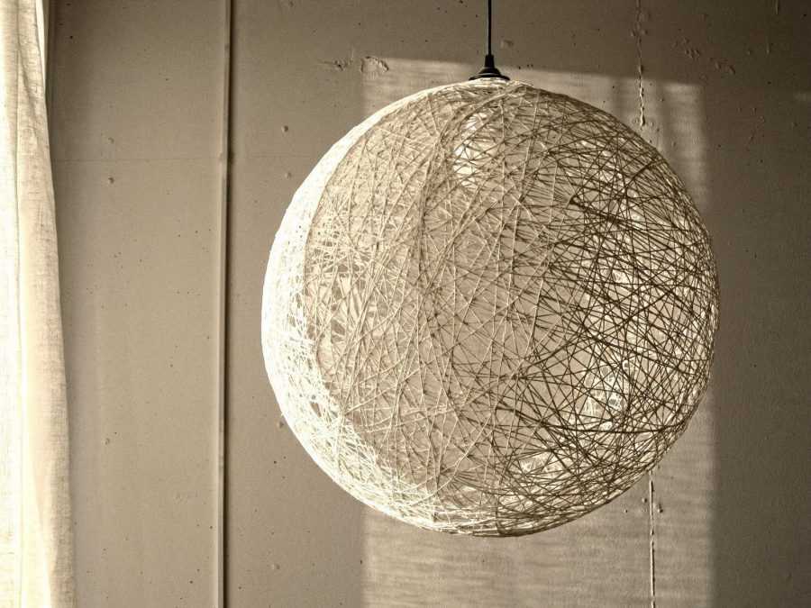 Самодельный абажур из ниток (пряжи) изготавливается без каркаса. Для реализации идеи такого декора потребуется лишь временная основа, в качестве которой подойдёт воздушный шарик. Его надувают и обматывают нитками, которые затем проклеивают. Если сплести несколько таких изделий, можно сделать большой и необычный светильник.