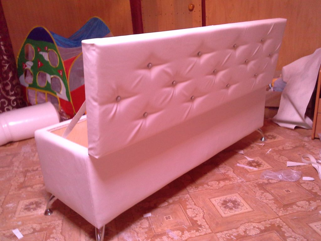Поле чего к верхнему слою приклеивается поролон, а сверху него ложится синтепон, в качестве подкладки. Самой деликатной работой при сборке является обивка банкетки плотным материалом.