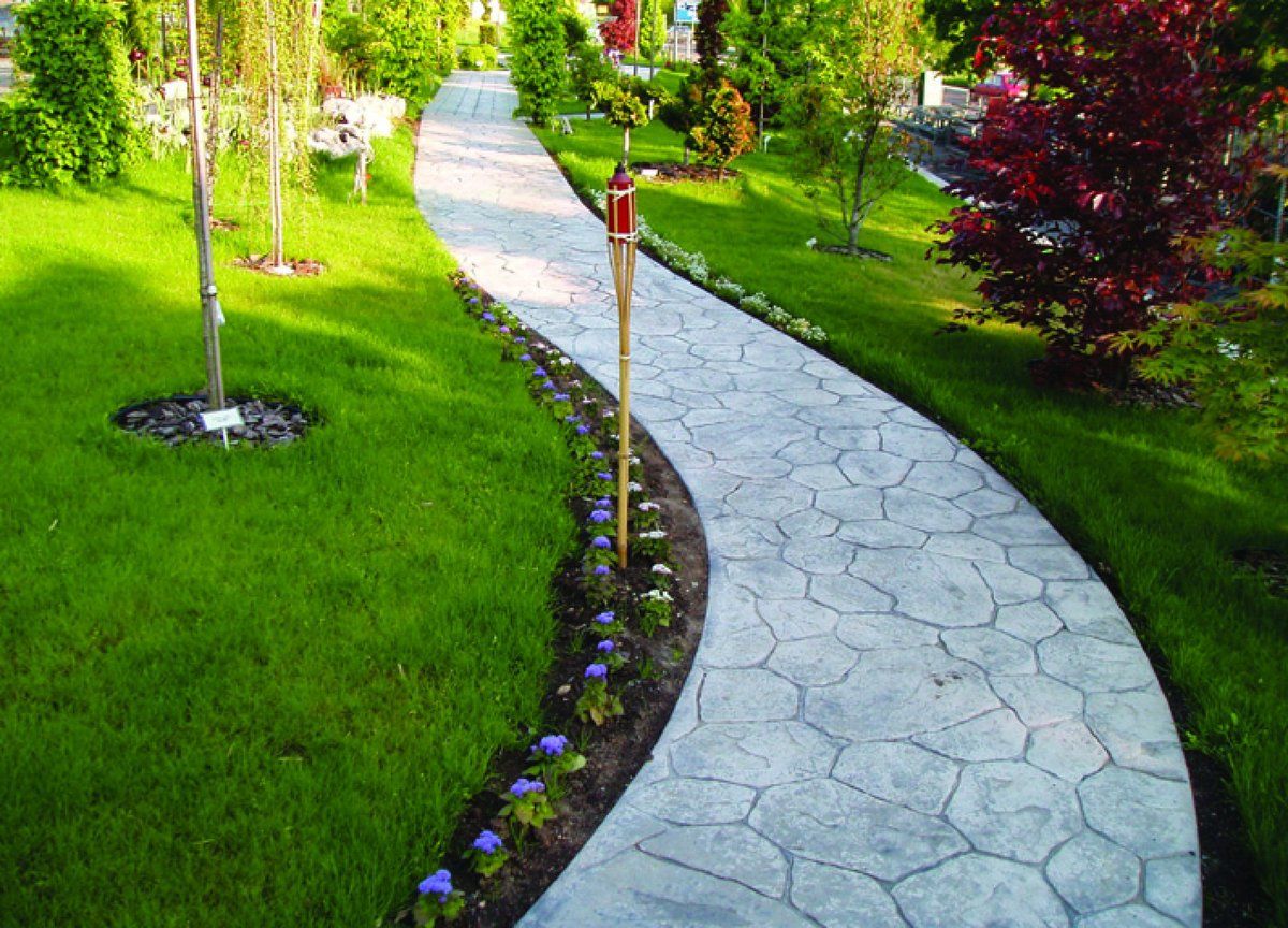 Прекрасное сочетание почти со всеми материалами для декорации.Обратите внимание, что перед тем, как приступить к работам по укладке дорожек, следует разработать план, на котором будет указано расположение, конфигурация и длина. Также следует учесть маршруты, по которым часто будут передвигаться члены семьи или технические устройства, от чего и будет зависеть конечная ширина дорожек из бетона на даче своими руками.