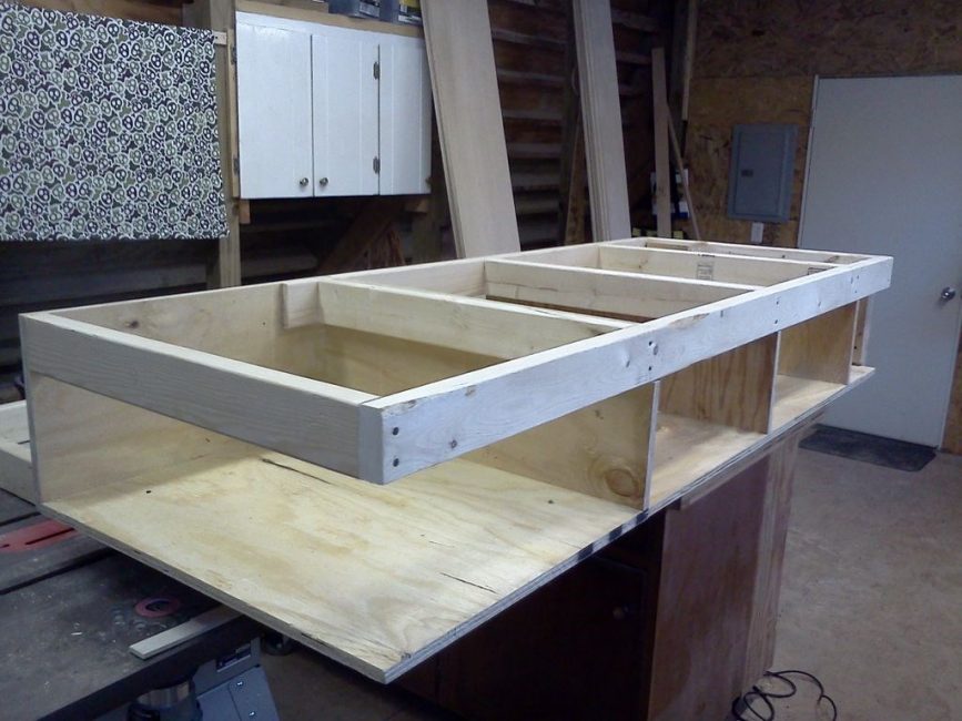 В случае использования дивана его необходимо прикрепить к коробу. Для этого подготавливаются боковые опоры, представляющие собой два вертикально расположенных бруска, стянутые другими брусками, меньшими по размеру. Таких опор должно быть две, для обеих боковых сторон.