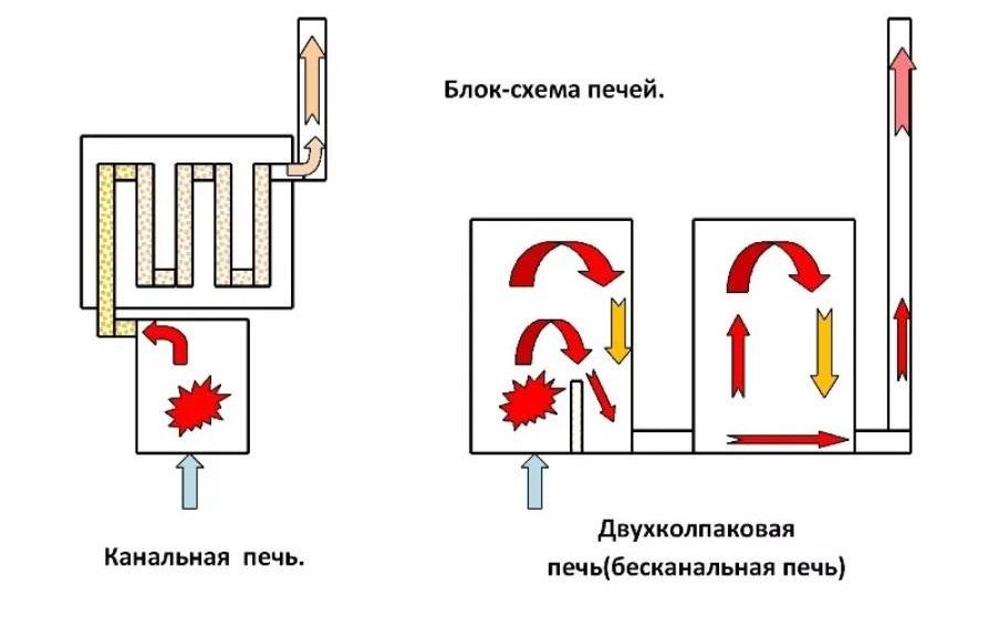 Принцип действия устройств Кузнецова учитывает естественные свойства горячего воздуха и, выделяющихся при сгорании топлива, газов. Конструкция кирпичной печки отличается тем, что дым удерживается внутри самой печи. Для этого оборудуется так называемый колпак — топочная камера, представляющая собой закрытый купол, куда поднимается наиболее раскаленный воздух, вытесняя остывающий через нижний боковой отвод.