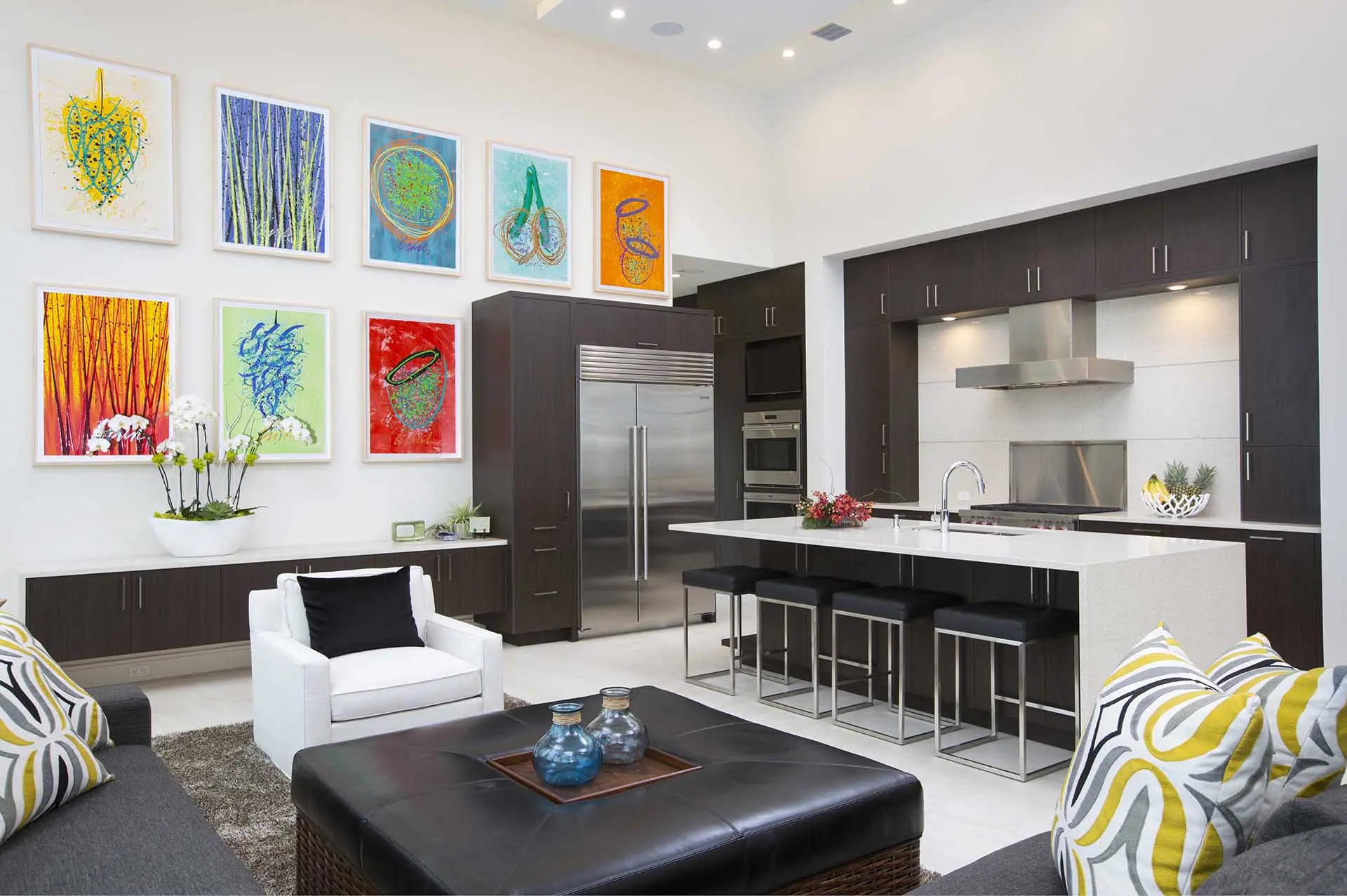Важно использовать практичные ткани, которые имеют специальную пропитку. Для украшения стен хорошо подходят изображения в рамках под стеклом, объединённые общей темой