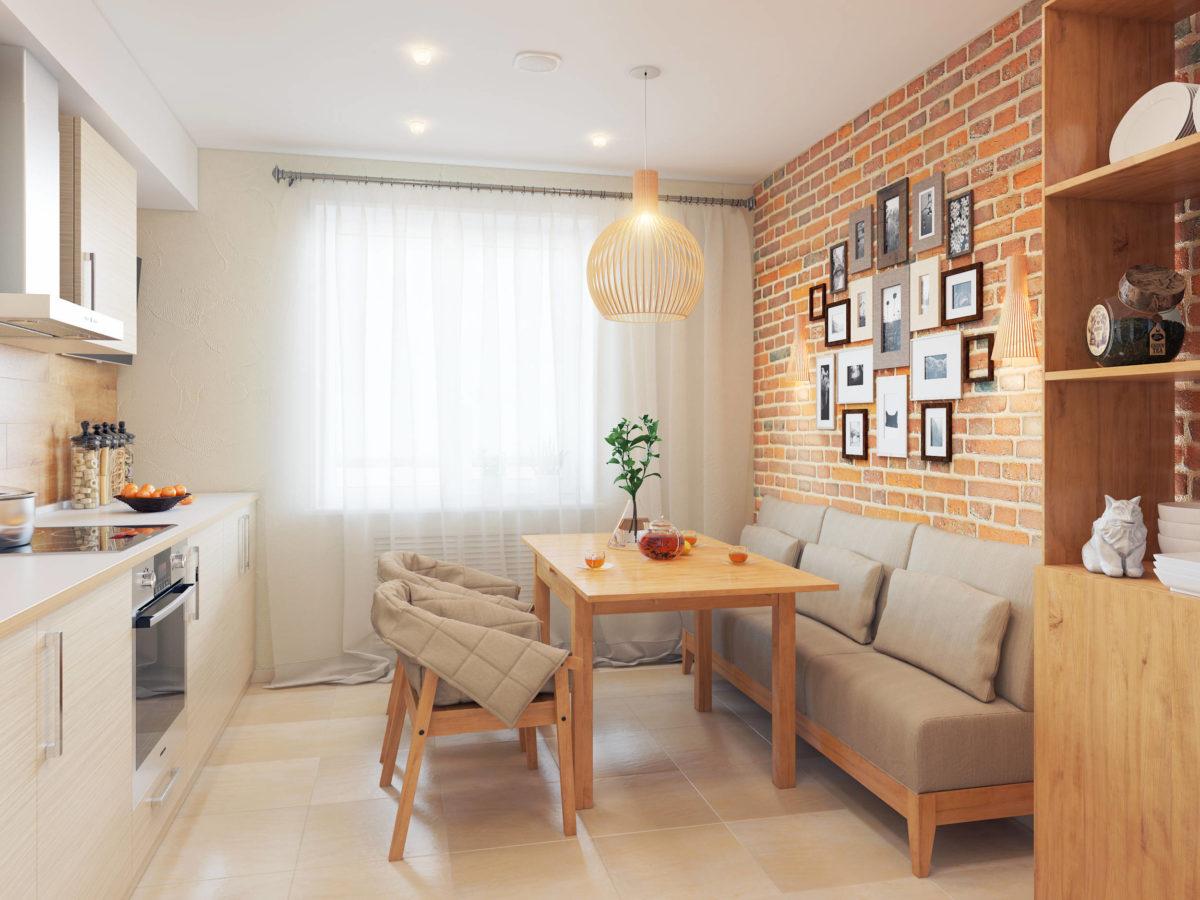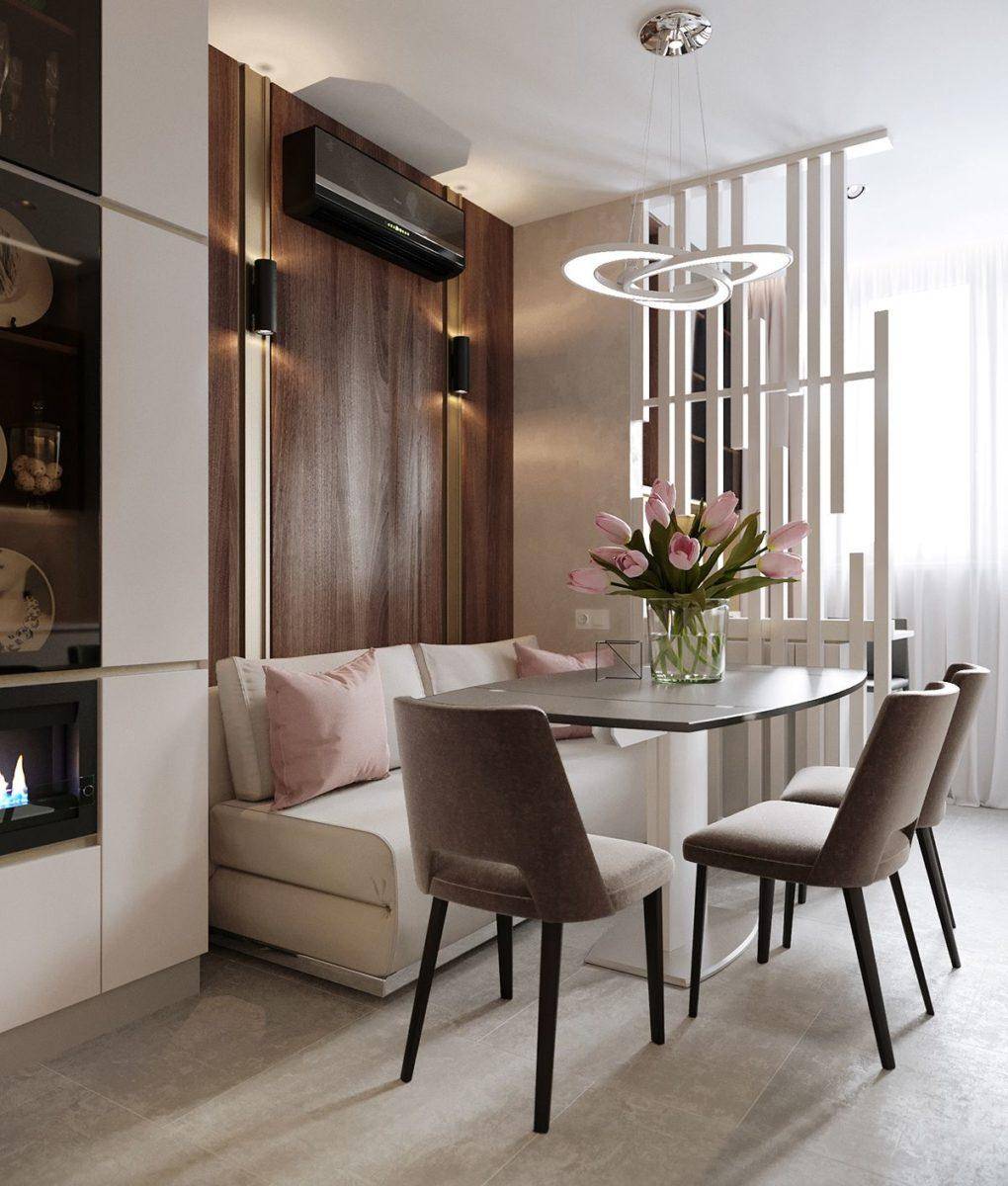 В столовую зону устанавливают небольшой стол со стульями. Если позволяет место, обустраивают зону для отдыха с мягким уголком или диваном с креслами. Уютнее смотрится кухонный стол круглой формы, украшенный скатертью с водоотталкивающей пропиткой, которая защитит поверхность от мелких повреждений.