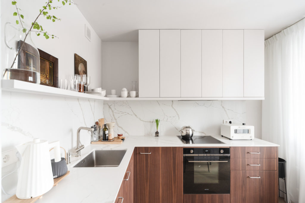 Отдельно стоящая мебель и техника может не подходить под габариты тумб и шкафов. Со встроенной таких проблем не будет: по стандарту ее ширина 60 или 90 см. Большой плюс встроенного варианта – цельная столешница, без зазоров и щелей между тумбами.