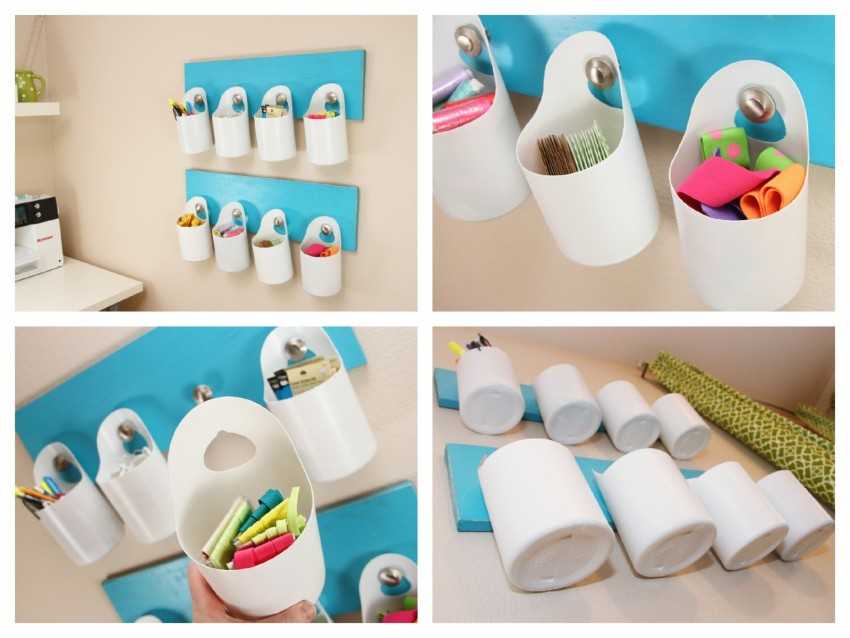 - Подставки для органайзера под канцелярию можно изготовить из пластиковых бутылок от шампуня. Емкость разрезается на 2 части, линия среза должна быть плавной либо фигурной. В верхней части вырезаются ручки и приклеиваются к нижней части. К задней части емкостей приклеиваются липучки, с помощью которых емкости фиксируются на полотно и подвешиваются к стене.