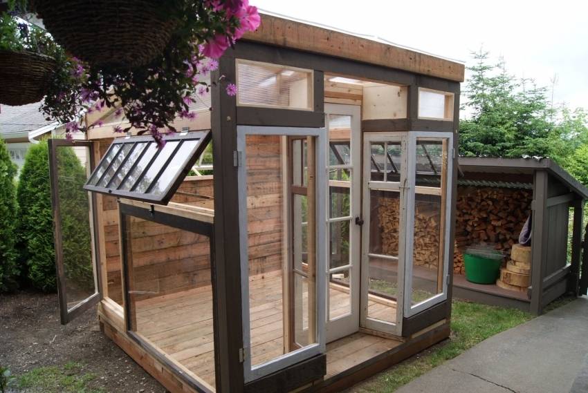 Строительство высокой теплицы из старых окон и дверей позволяет установить удобные полки для выращивания как низких, так и высокорослых растений