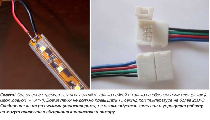 - К контактам припаивают 2 кабеля (желательно) или соединяют их с помощью коннекторов (не рекомендуется).