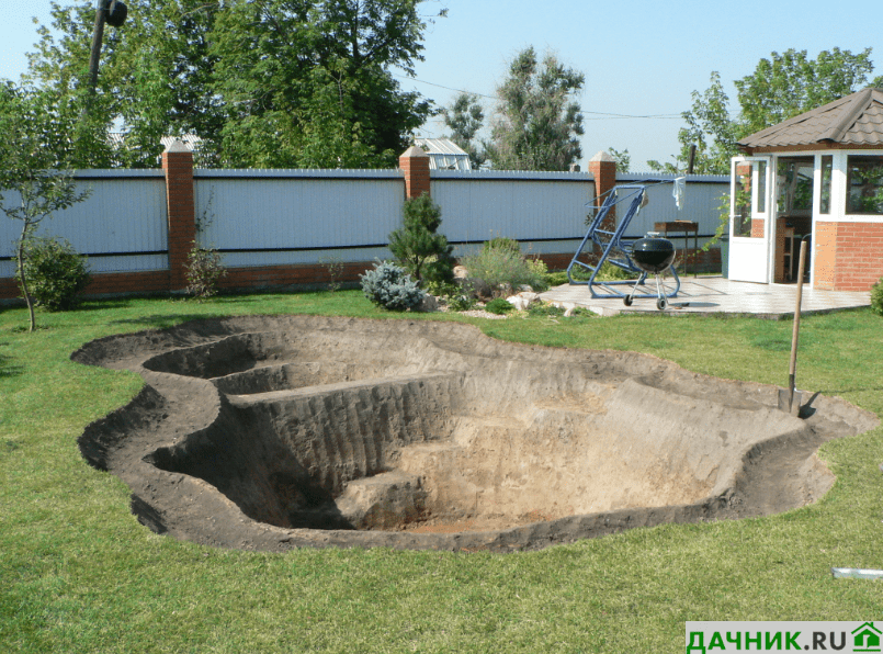 Такое озерце необходимо возводить летом, иначе не получиться залить качественно бетон. Делается всё по классической схеме: сначала рисуется эскиз, потом – разметка, а затем копается котлован.