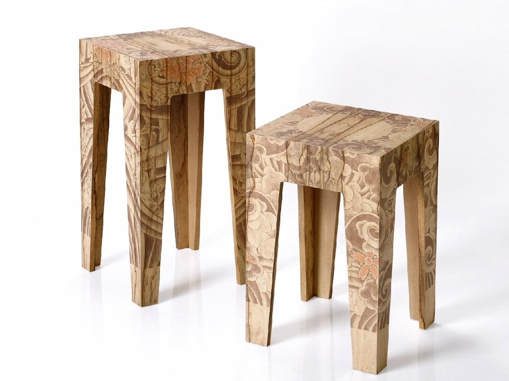 Тот, кто хорошо владеет бензопилой, может создать оригинальный предмет мебели из бревна. Для этого в толстом чурбаке нужно сделать три аккуратных боковых пропила, формирующих ножки. Сделав точную разметку на обрезках одного ствола, можно выпилить из них комплект из двух табуреток, вкладываемых одна в одну.