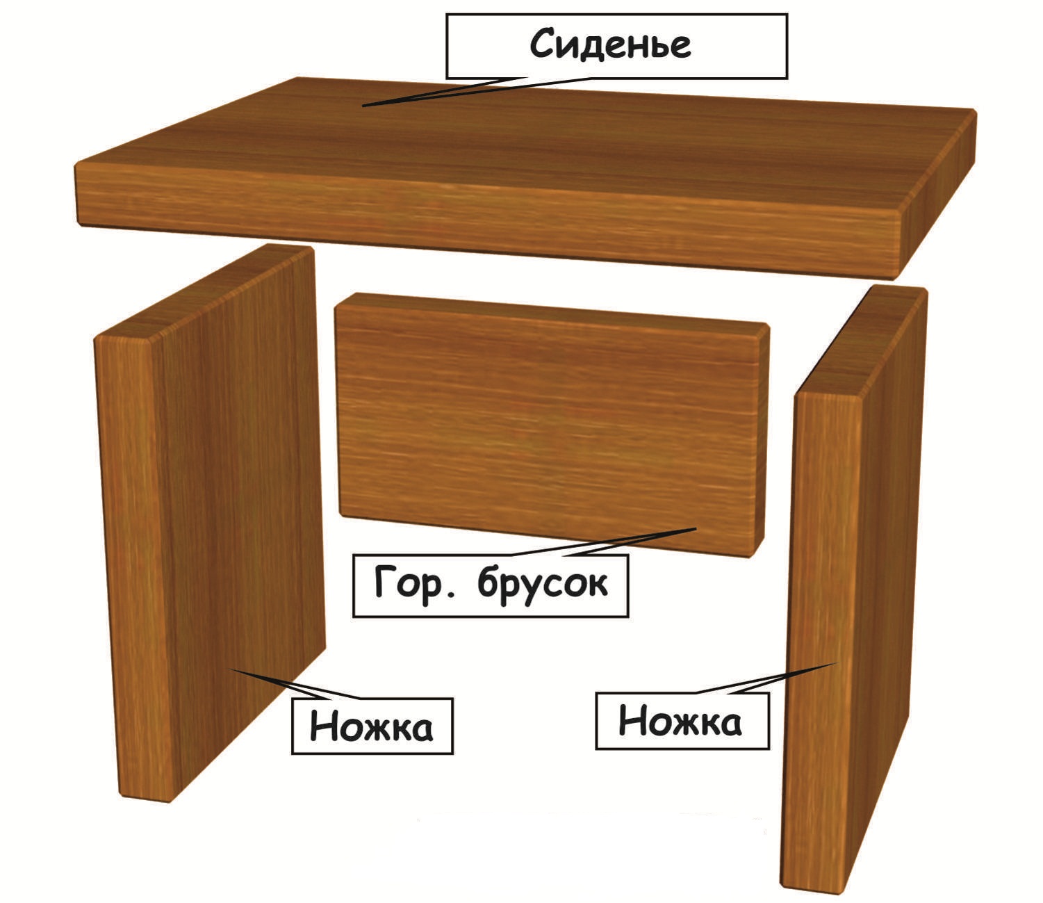 Подготовить 3 детали с пазами для ножек и 1 деталь для сиденья