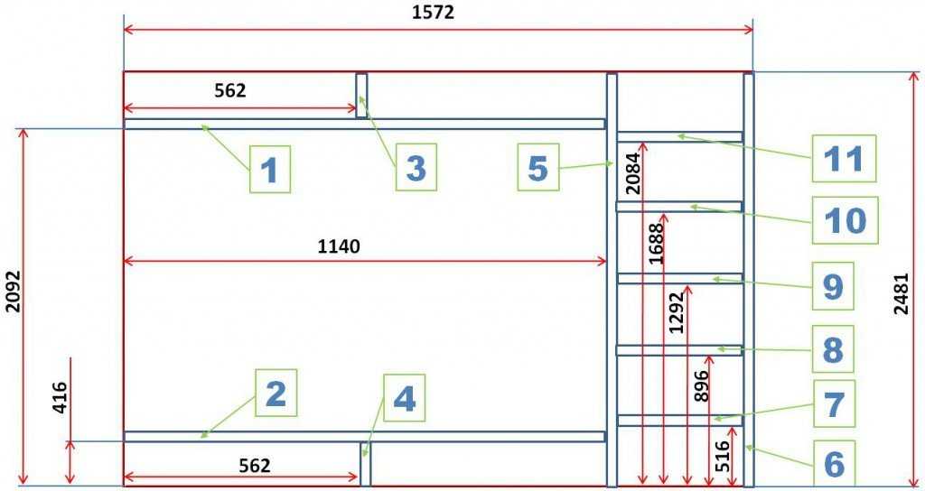 После завершения всех подготовительных работ, необходимо выполнить чертеж будущего шкафа. При этом обязательно учитывать количество, размер и расположение полок. Только в этом случае удастся сделать его действительно удобным для всех членов семьи.
