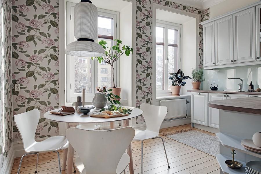 - стиль помещения: обои должны соответствовать не только кухонному гарнитуру, но и общей цветовой гамме комнаты. Старинные стилевые направления предполагают использование обоев с классическими и строгими геометрическими узорами, а также с элементами флористики и природной тематики. Для более современных интерьеров подойдут обои с абстракцией, реалистичными композициями или однотонные покрытия с рельефом и без него;