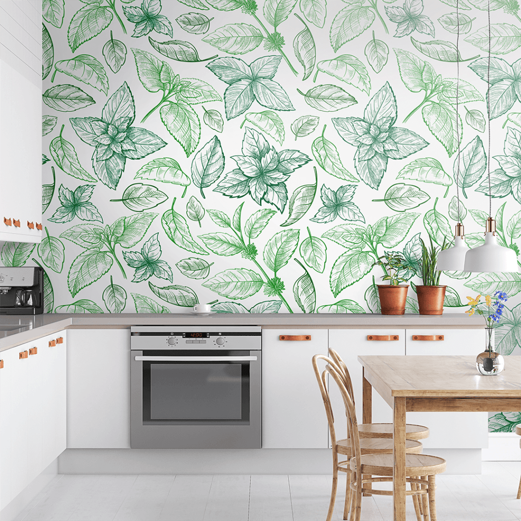- Растительные принты. Под это определение подпадают изображения листьев, ветвей, деревьев и др. Подобная отделка наполняет атмосферу кухни свежестью, идеально подходит для дизайна в экостиле.