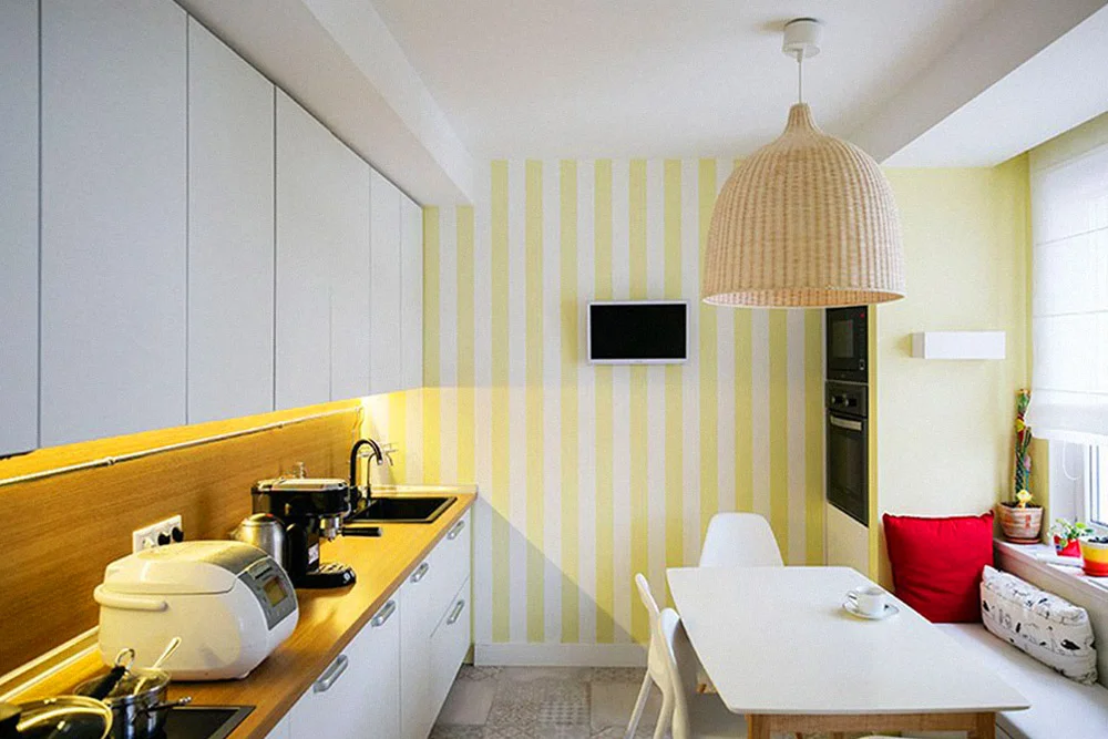 Совет! Не стоит забывать и о предварительном планировании. Вначале следует выбрать цвет и фактуру материала (для маленьких кухонь – светлые оттенки, не скрадывающие пространство), а затем – рассчитать количество рулонов, исходя из площади комнаты.